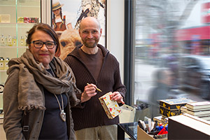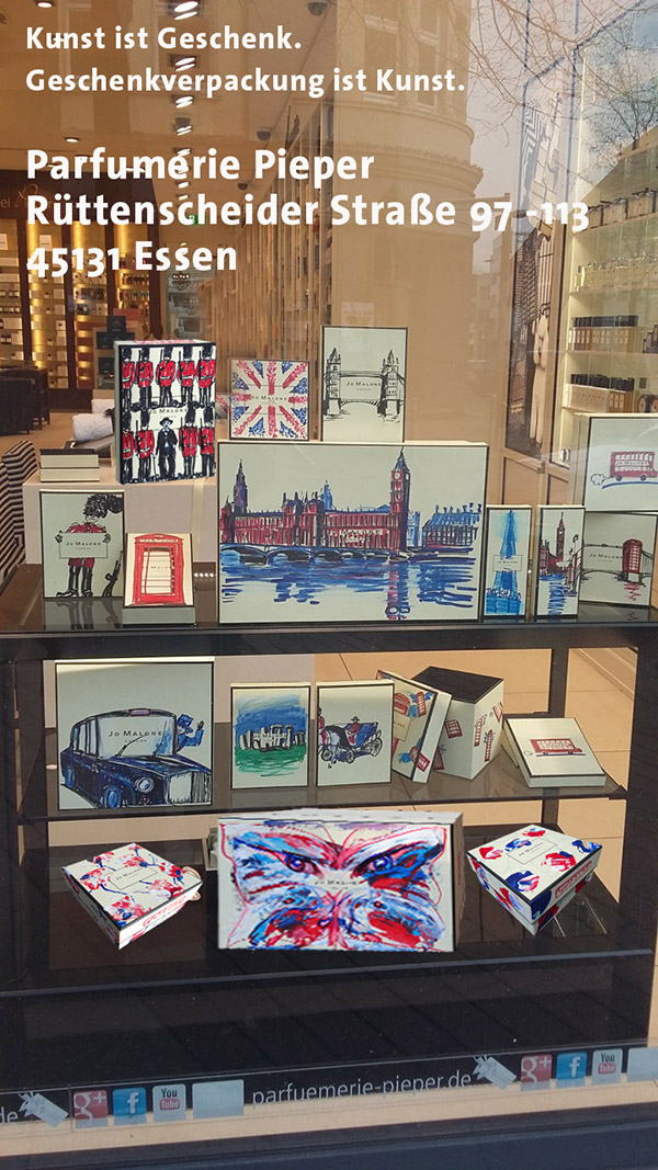 heute waren Eugen Bednarek und Gabriele Hüsgen im Rahmen eines Events des britischen Parfumlabels Jo Malone bei Pieper in Rüttenscheid. Bednarek bemalte Kartonagen für Jo Malone, Hüsgen stellte ihre Schmuckobjekte aus.