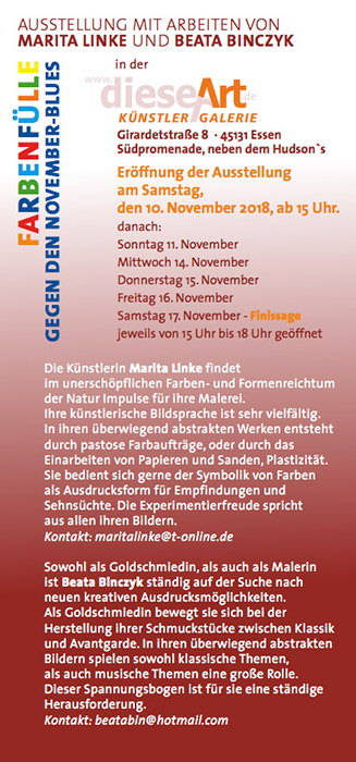 wir laden Sie zur Vernissage, am Samstag, den 10.11.2018 von 15 Uhr bis 18 Uhr
